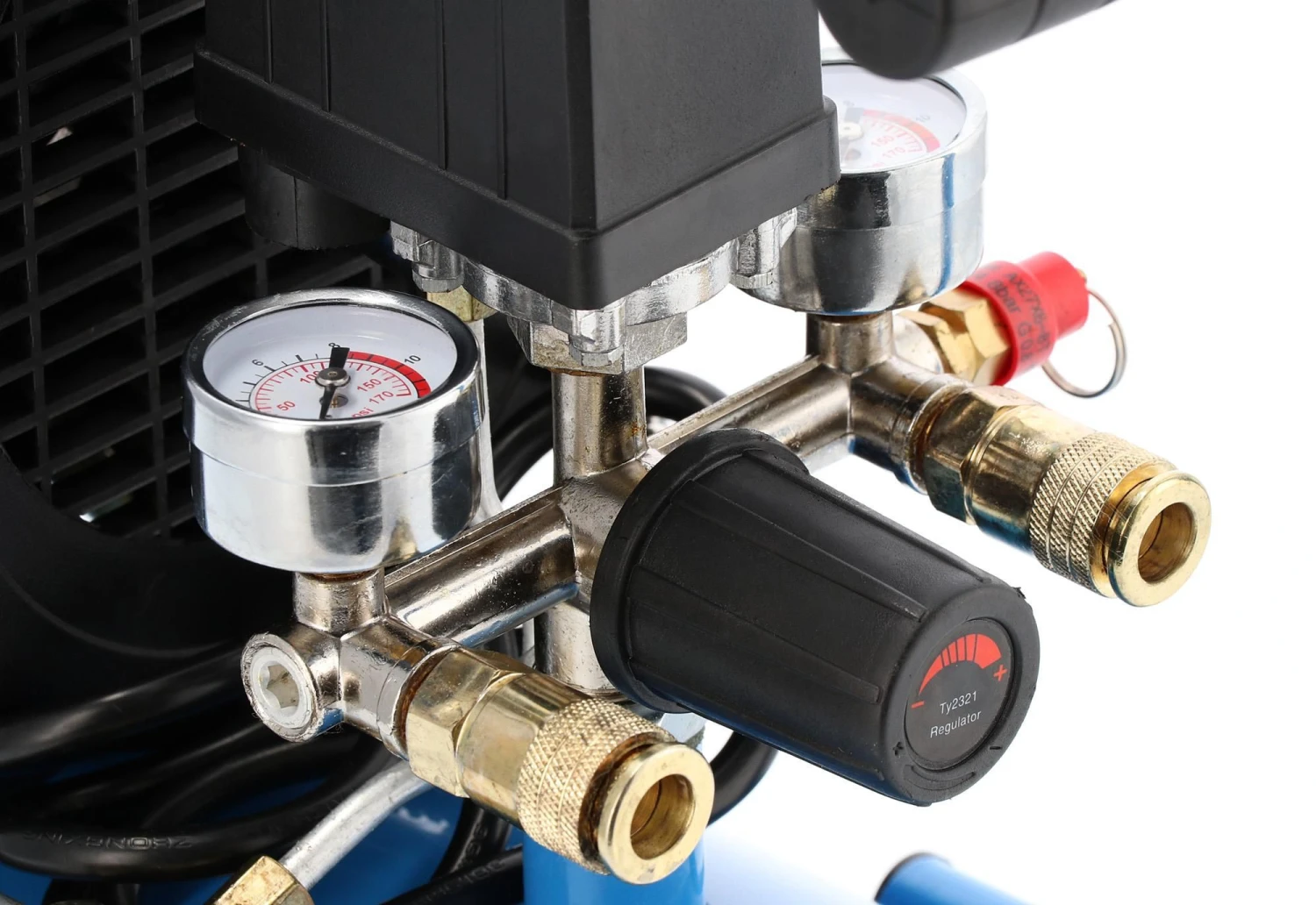 De compressor wordt uitgevoerd met twee universele snelaansluitingen, waarvan één voor de maximale druk en de andere voor de gereduceerde druk is. Met het reduceerventiel, te herkennen aan de zwarte knop, stel je snel en eenvoudig de gewenste werkdruk in. Op de manometer voor de gereduceerde druk, aan de rechterkant van de drukschakelaar, kun je de werkdruk aflezen. De andere manometer is voor de druk in het drukvat.