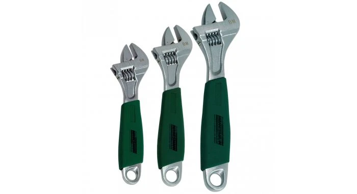3 Moersleutels, 6 – 8 en 10″ van hoogwaardig matverchroomd staal. Ergonomisch gevormde antislipgreep, speciaal gefreesde en geharde rol en bek met schaalverdeling in inch en mm. Bereik max. 20, 25 en 30 mm.