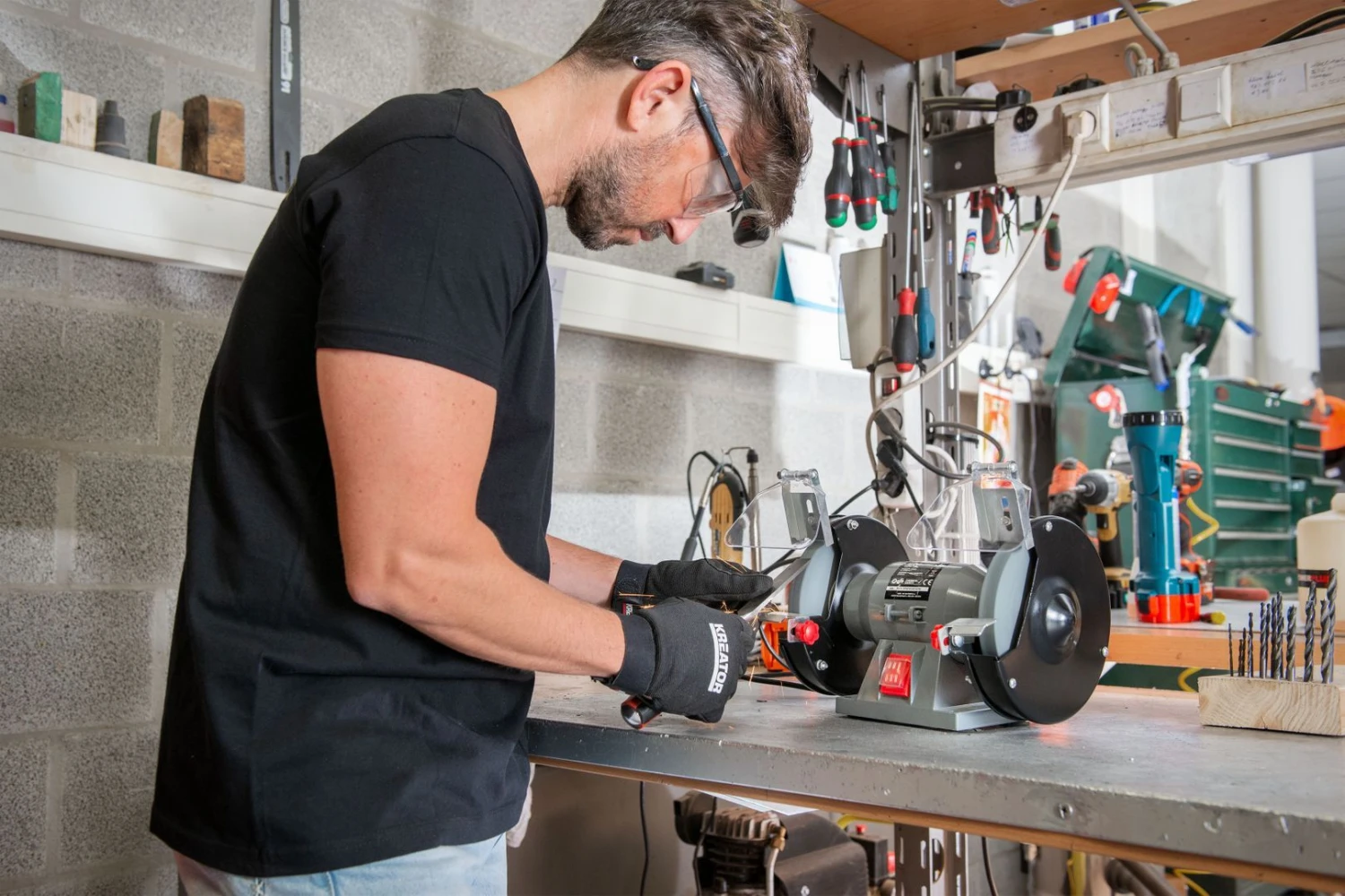 Het vonkenscherm en de afschermkap beschermen je ogen optimaal. Handig is ook de werkstuksteun, waarop je het werkstuk op kan laten rusten tijdens het slijpen. Tegelijk heb je zo een nog betere controle.