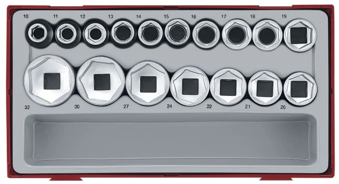 17x Dop – Zeskant – 1/2″: 10, 11, 12, 13, 14, 15, 16, 17, 18, 19, 20, 21, 22, 24, 27, 30 en 32 mm